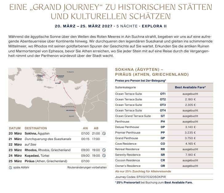 Die Explora II - Reise findet statt vom 20.-25.03.2027, die Luxus Suite OT 2 ist für 2180 Euro buchen (OT 1 ist bereits ausgebucht).